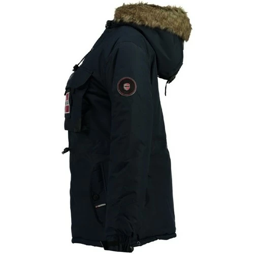 Parka Femme Geographical Norway Bulle New. Cette Parka passe-tête possède un demi-zip, une capuche fixe bordée d’une fourrure synthétique amovible. Une poche à rabat brodée est plaquée sur le devant. Les poignets, le bas du vêtement et la taille sont ajustables. Sur la manche se présentent une poche plaquée zippée et un badge PVC. Une ouverture zippée se situe également sur le côté.