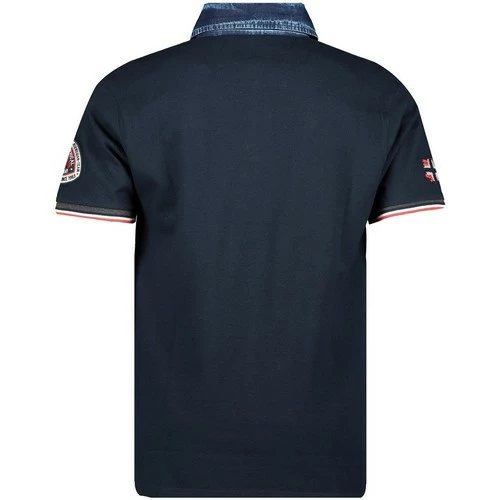 Polo manches courtes Homme Geographical Norway Koptaine avec col boutonné. Ce polo possède un drapeau et un badge ainsi que des broderies et impressions sur le torse et sur les manches. Le col couleur jean apporte une touche décontractée à ce polo au bout des manches de finition discrète tricolore.
