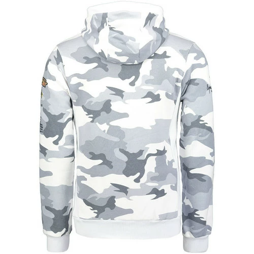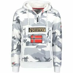 Sweat à capuche Geographical Norway, camouflage Le sweat à capuche Geo Norway pour homme, coloris gris, blanc. Un sweat hiver en molleton dans un look camouflage. Le sweat Geographical Norway en détails : – Fermeture éclair au niveau du col – 2 poches sur les côtés + 1 poche centrale (fermeture par scratch) – Ecusson Géographical Norway et drapeau sur l’avant – Broderies et logos de la marque sur les manches. – Bas du sweat, des manches et côtés en bords élastiques (pour un meilleur maintien) – Composition : 65% coton et 35% polyester.