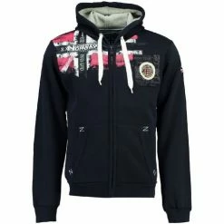 Sweat zippé à capuche Homme Geographical Norway Fespote New. Ce sweat comporte une capuche possédant un lien de serrage avec oeillets métalliques et embouts. Il possède une fermeture zippée intégrale sur le devant ainsi que deux poches kangourou sur le bas du vêtement. Il présente une poche sur le torse ainsi que des impressions, broderies et badges sur le torse, sur les manches et dans le dos.