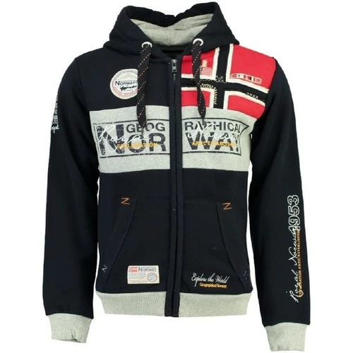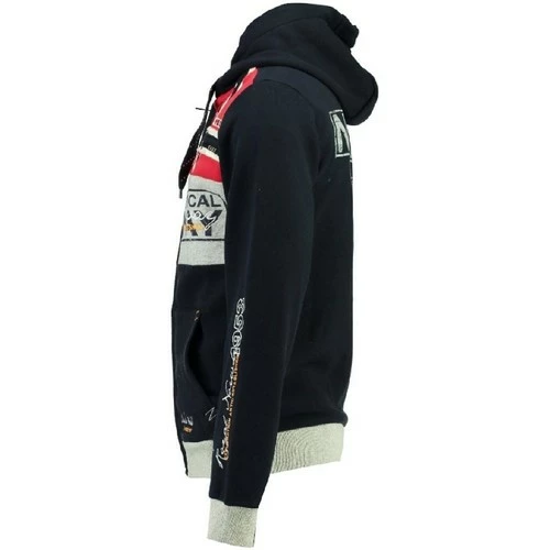 Sweat Homme à capuche Geographical Norway Flyer New. Ce Sweat à capuche possède une fermeture zippée intégrale sur le devant et deux poches kangourou. Il comporte de nombreuses impressions, broderies et badges sur la poitrine, le dos et sur les manches. Le thème principal est ‘Royal Norway’ avec la présence d’un grand drapeau norvégien sur le devant.