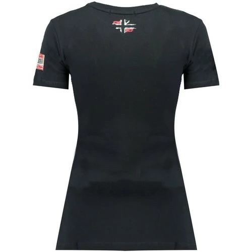 Tshirt Femme Geographical Norway Jarry. Ce Tshirt manches courtes, à col rond et très féminin, possède de nombreuses impressions et broderies stylisées sur la poitrine.