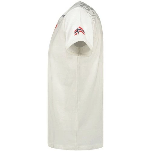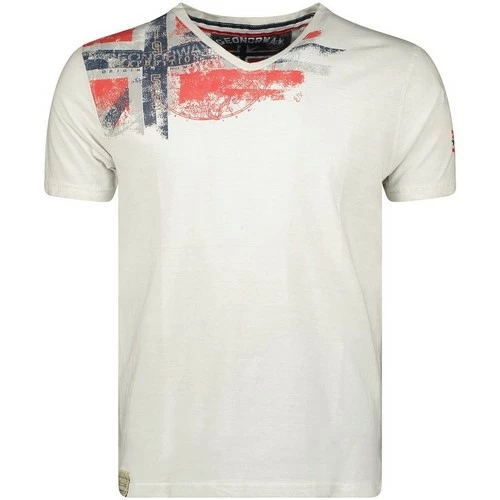 Tshirt manches courtes Homme GeoNorway Jimac. Ce Tshirt à col V possède une large impression du drapeau norvégien sur le torse et de GeoNorway au dos.