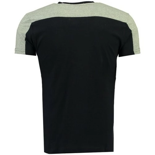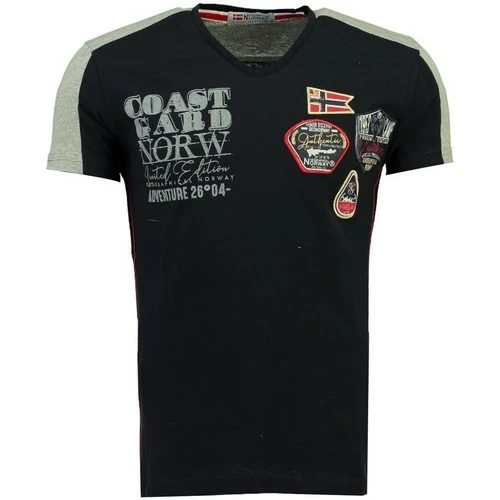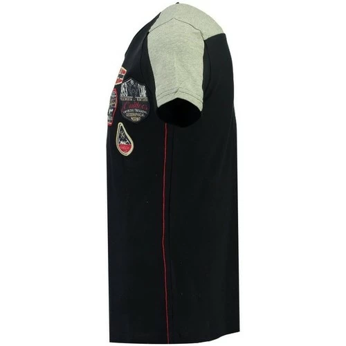 Tshirt manches courtes Homme Geographical Norway Javiation à col V. Il possède de nombreuses impressions sur la poitrine. Une bande couleur contrastée va d’une manche à l’autre en passant par les épaules.